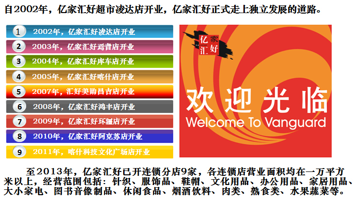 億家匯好商貿有限責任公司于2002年成立,并從臺灣引進連鎖經營職業管理團隊,統一管理旗下各地的連鎖超市。公司通過多年的穩健發展,至2013年底,億家匯好商貿有限責任公司已成為擁有員工近3000多人,下轄一個配送中心和9家連鎖超市的大型綜合性零售企業??偨洜I面積11萬多平方米,配送中心輻射公司所有超市,年配送額可達2億元。公司大量吸納下崗職工,經過崗前培訓,提高勞動技能,實現了他們的再就業,為維護社會和諧穩定做出了貢獻。2013年,巴州億家匯好商貿有限責任公司在自治區零售業中穩踞前三位,是自治區重要的流通龍頭企業,2013年年銷售收入達10億人民幣。多年來,公司一直重管理、抓實效、運用先進的管理手段和營銷理念,秉承億家匯好人 時時尋求效率創新,事事講究專業技術的文化精髓,創造了良好的經濟效益和社會效益。公司先后多次被消費者協會評為誠信單位,并多年被評為重合同,守信用單位。